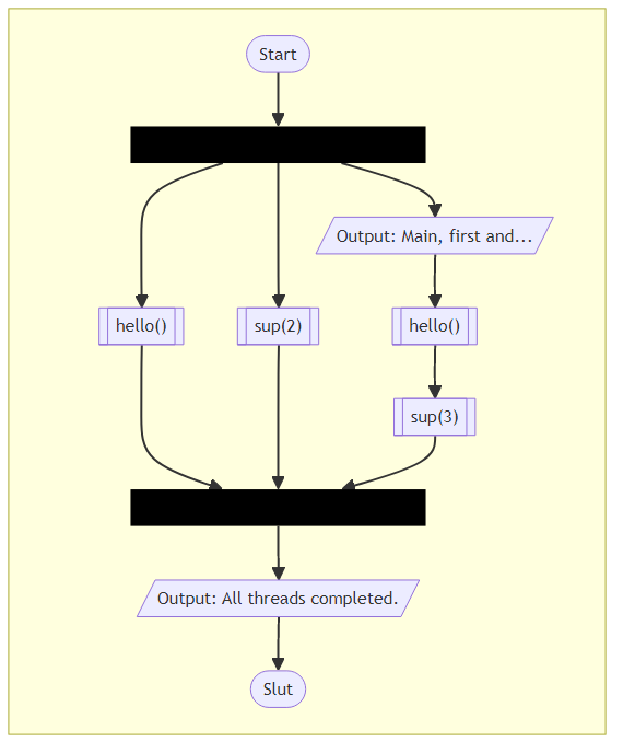 For at designe eller dokumentere programmer med samtidige aktiviteter, kan man gøre brug af et aktivitetsdiagram. Det minder om et rutediagram, men aktiviteter der kan udføres samtidigt markeres med tykke sorte linjer. Se evt. wiki.